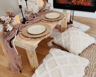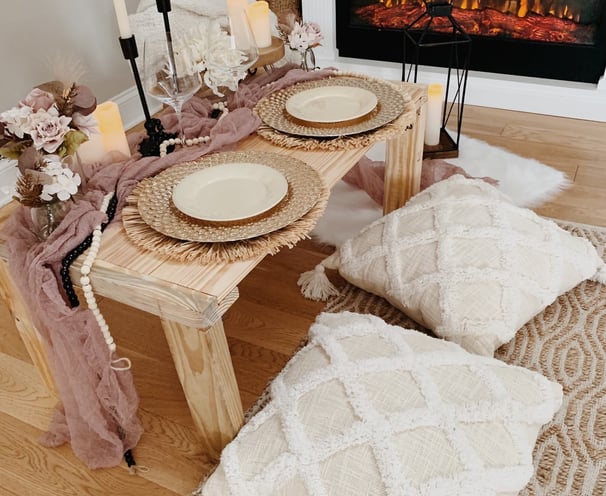 Picnic includes: Low level picnic table, posh table decor, tableware including plates, glassware and utensils, led candles, hand sanitizer, comfy pillows and blanket, two bottles of sparkling water, waste basket and a personalized letter board greeting. Set up and break down.